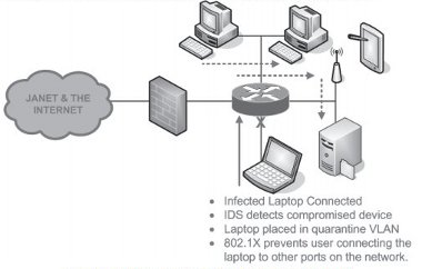Every large network is likely to have seen computers which have been compromised by viruses, worms and trojans. Restricting the network access for these computers is a standard requirement of the IT Service provider at any organisation. 802.1X together with other systems can help by providing the facility to quarantine compromised computers.